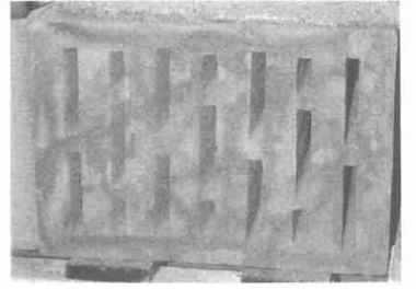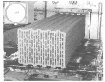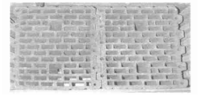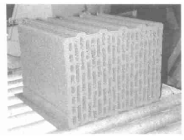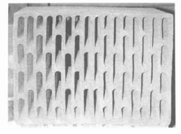 抗壓強度為4. 4N/mm2。該多孔磚的缺點是;其在工業(yè)化的生產中不可避免地會出現(xiàn)扭曲變形,因此,擠出型的微孔多孔磚必須具有足夠厚度的外壁和齒狀的凸起,便于磚相互間組裝拼接(見圖6),從而消除砂漿連接引起的熱力學問題。在隨后的試驗中還擠出成型了19排孔和13排孔的10DF微孔多孔磚見圖6圖7 ,這些磚外壁還有齒狀的凸起。