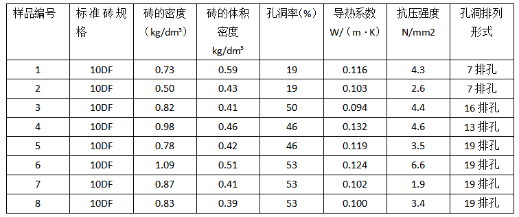 圖5為經(jīng)另一機口擠出的16排孔的短壁多孔磚,其磚坯的真實密度為0.82 kg/ dm3,孔洞率為50%時的體積密度為0.41 kg/ dm3,其導熱系數(shù)為人=0.094W/(m.K),