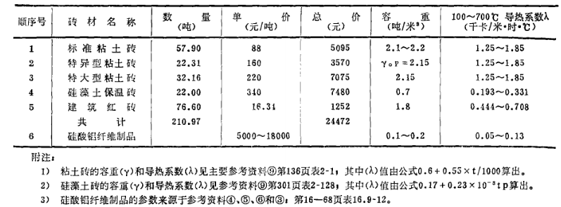 1.8米平拉退火窯用磚量和價(jià)格概算值及主要參數(shù)對(duì)照表