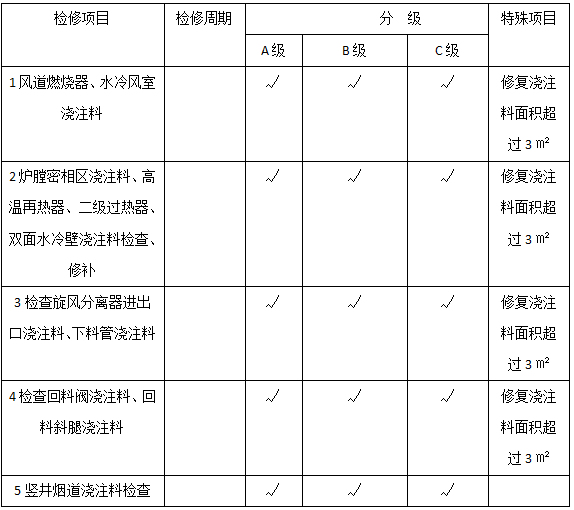 耐火耐磨保溫澆注料是循環(huán)流化床鍋爐應用較為廣泛的耐火材料之一,其主要被用于鍋爐環(huán)境較為惡劣、容易被損毀的風道燃燒器、爐膛密相區(qū)、旋風分離器、回料閥等部位。在進行爐襯檢修時,主要的項目如表1所示。